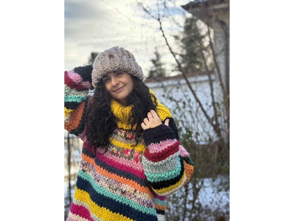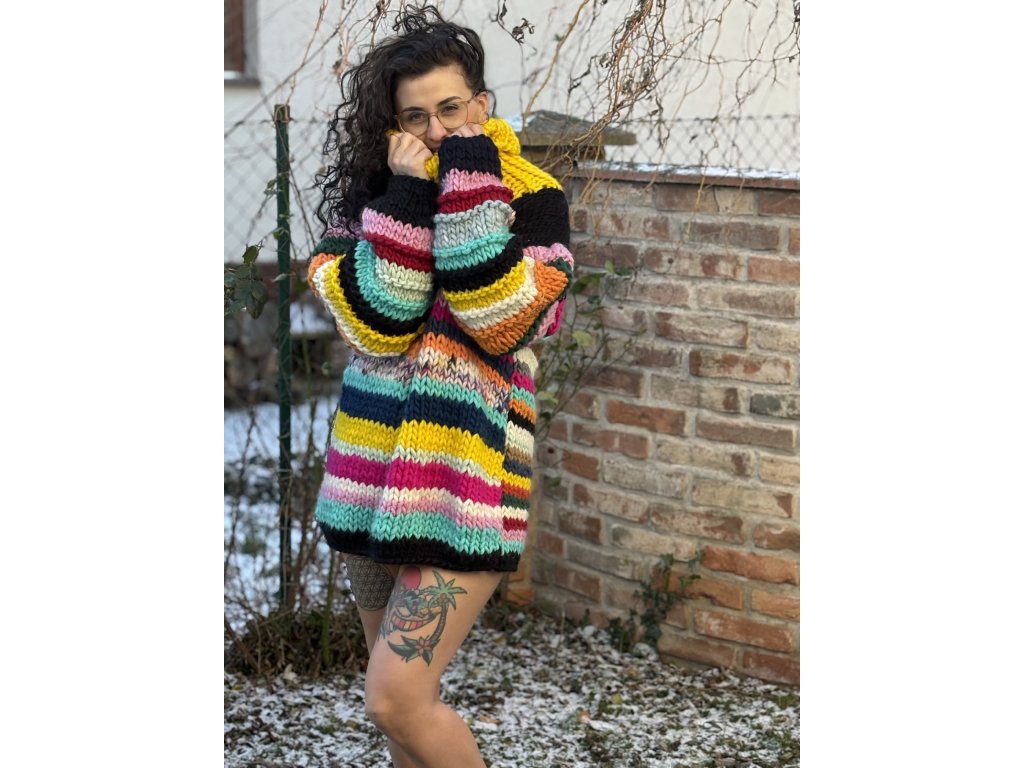 Objemný a teplý svetr v pestrých barvičkách je upleten ze 100% ovčí vlny ovcí vplně chovaných,s objemným rolákem,do kterého se zachumláte jako do peřinky.